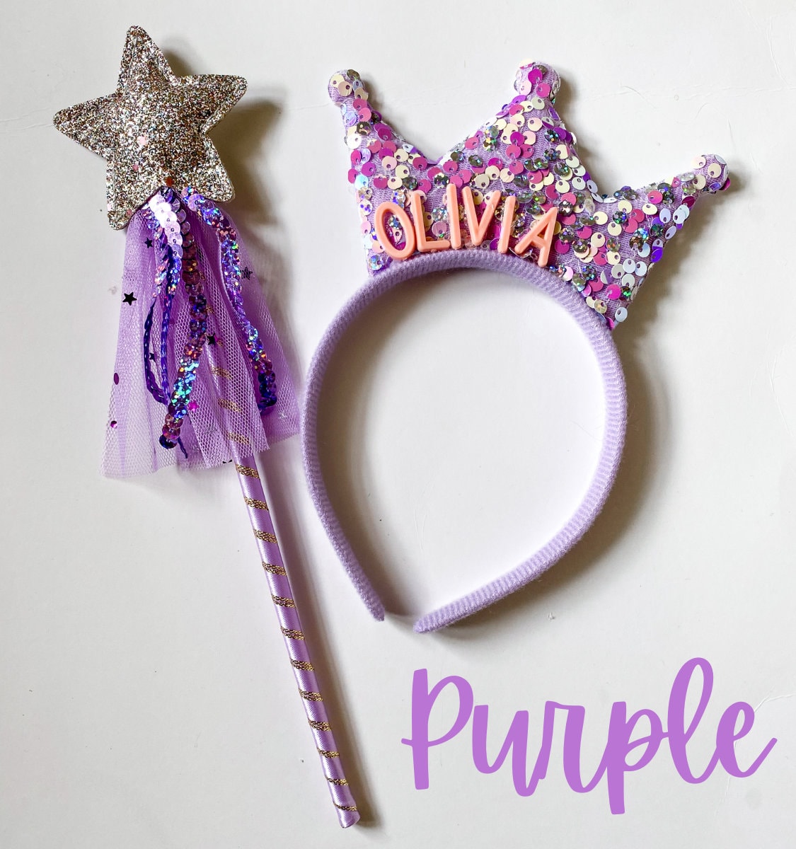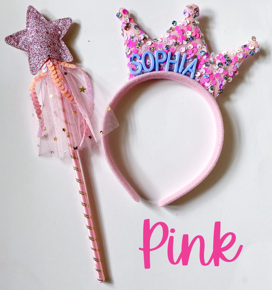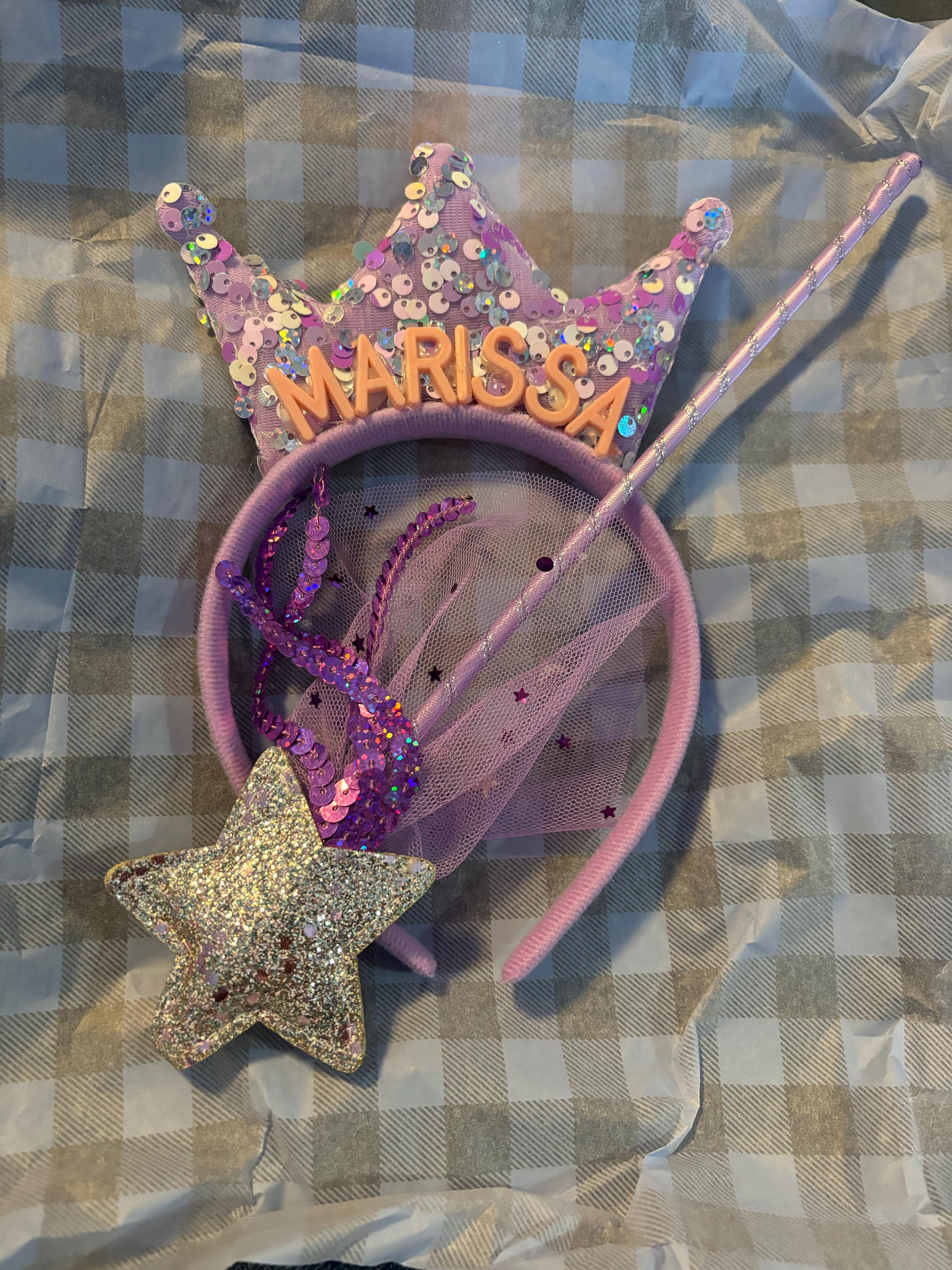 -Set includes 6 personalized tiara headbands with coordinating fairy wands