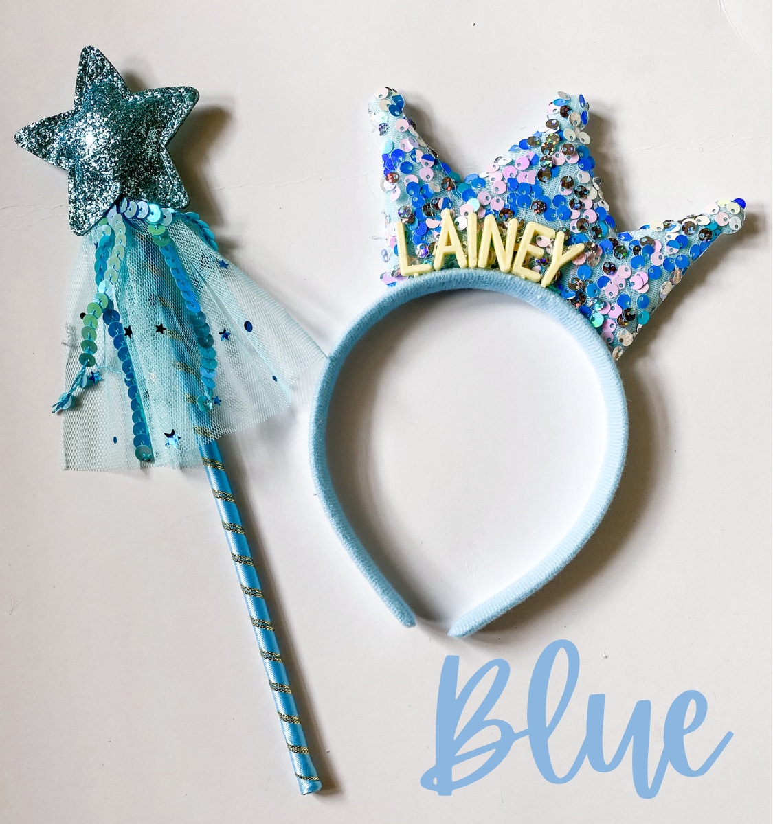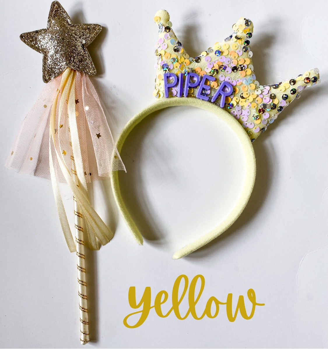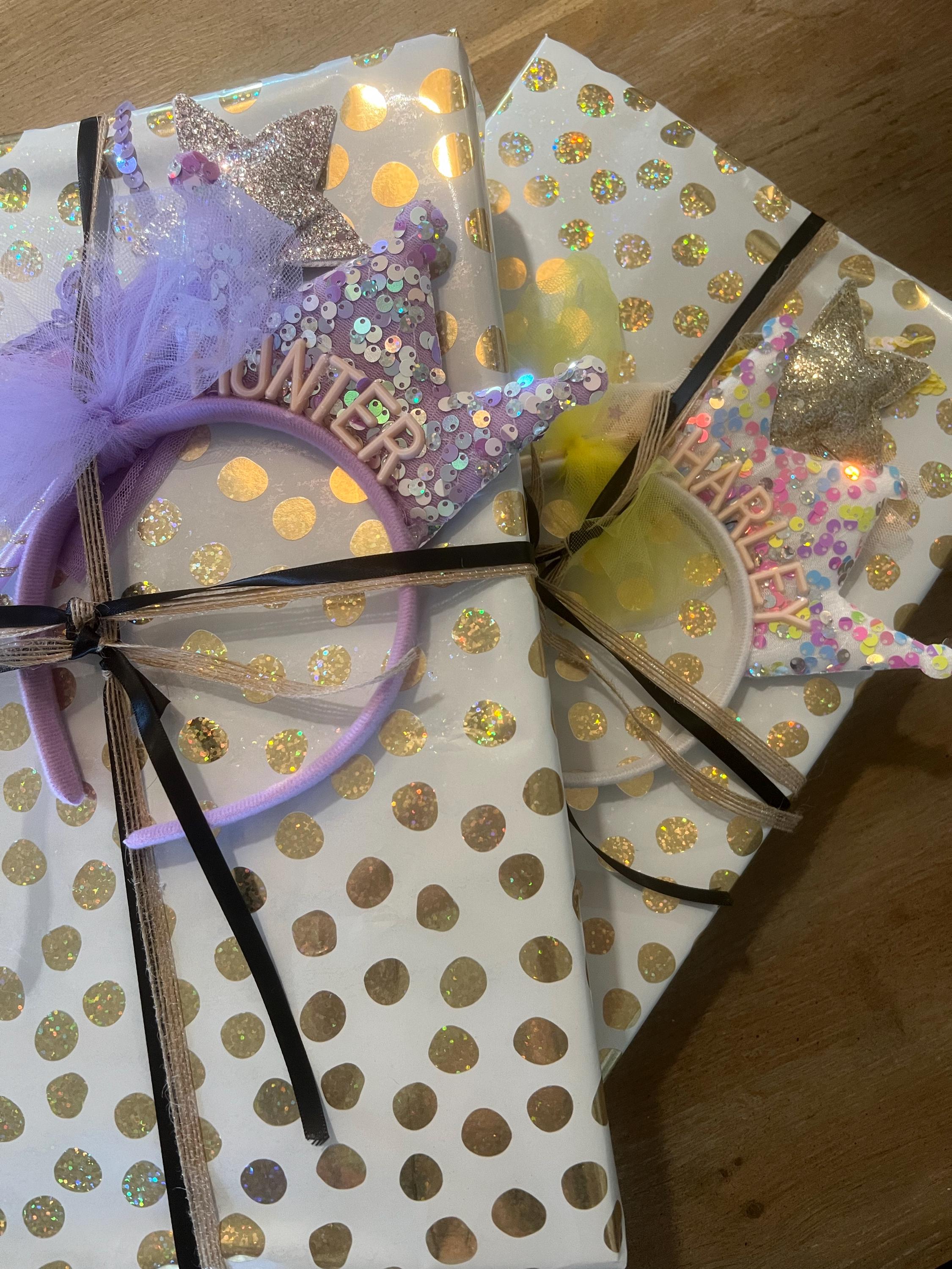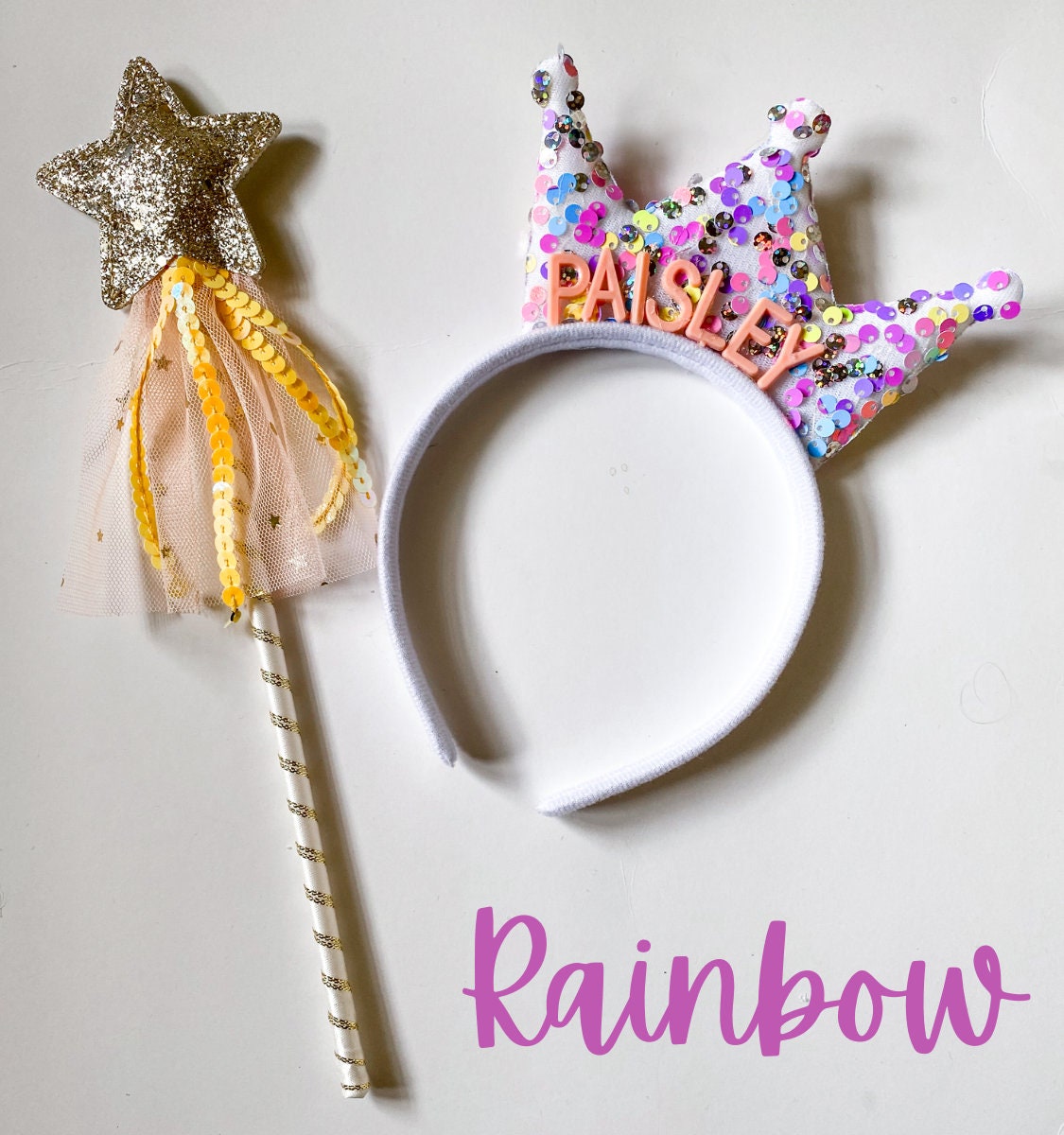 -Set includes 6 personalized tiara headbands with coordinating fairy wands