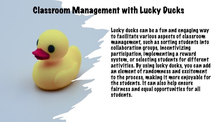 Lucky ducks can be a fun and engaging way to facilitate various aspects of classroom management, such as sorting students into collaboration groups, incentivizing participation, implementing a reward system, or selecting students for different activities. By using lucky ducks, you can add an element of randomness and excitement to the process, making it more enjoyable for the students. It can also help ensure fairness and equal opportunities for all students.